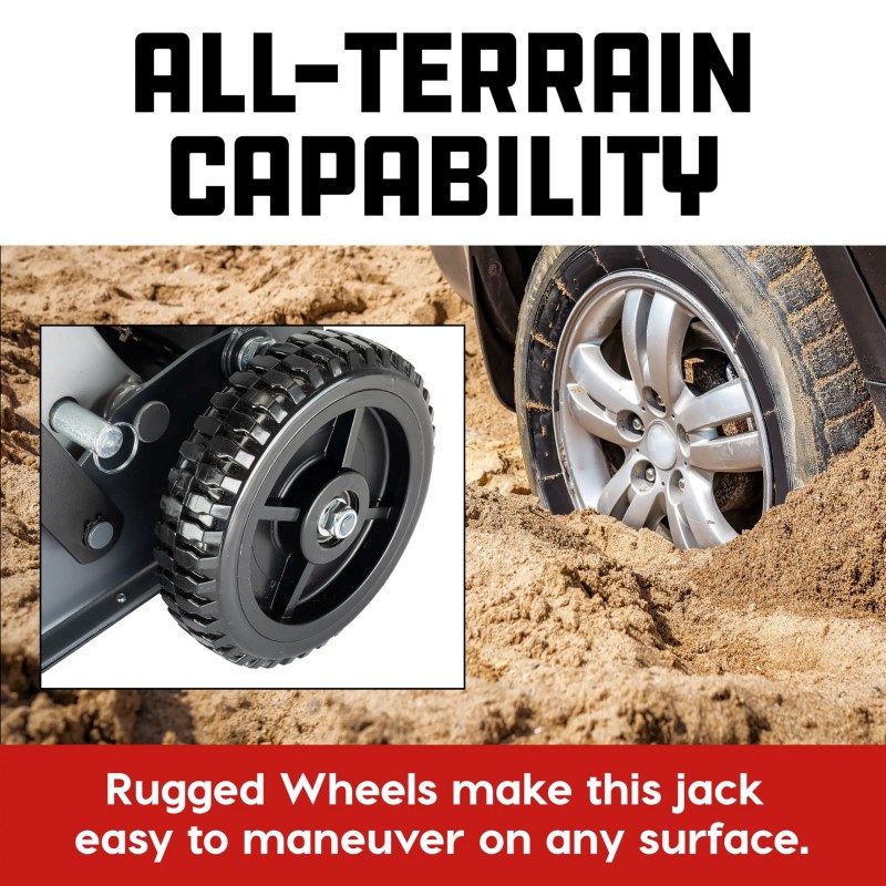 - Big Wheel Maneuverability: Features large, heavy-duty wheels that provide superior maneuverability. Easily roll the jack over challenging surfaces like concrete, gravel, or uneven terrain, ensuring quick positioning regardless of the workspace.