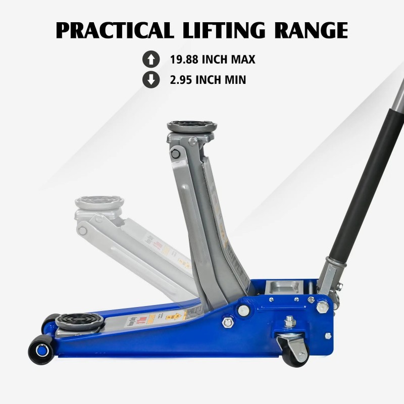 • Ultra-Low Profile Design: Starting at 3 Inches The jack's minimum height is an impressive 3 inches, allowing it to easily slide under low-ground clearance vehicles, including sports cars. It extends up to 20 inches, accommodating the higher stance of SUVs and light trucks, ensuring maximum market versatility.