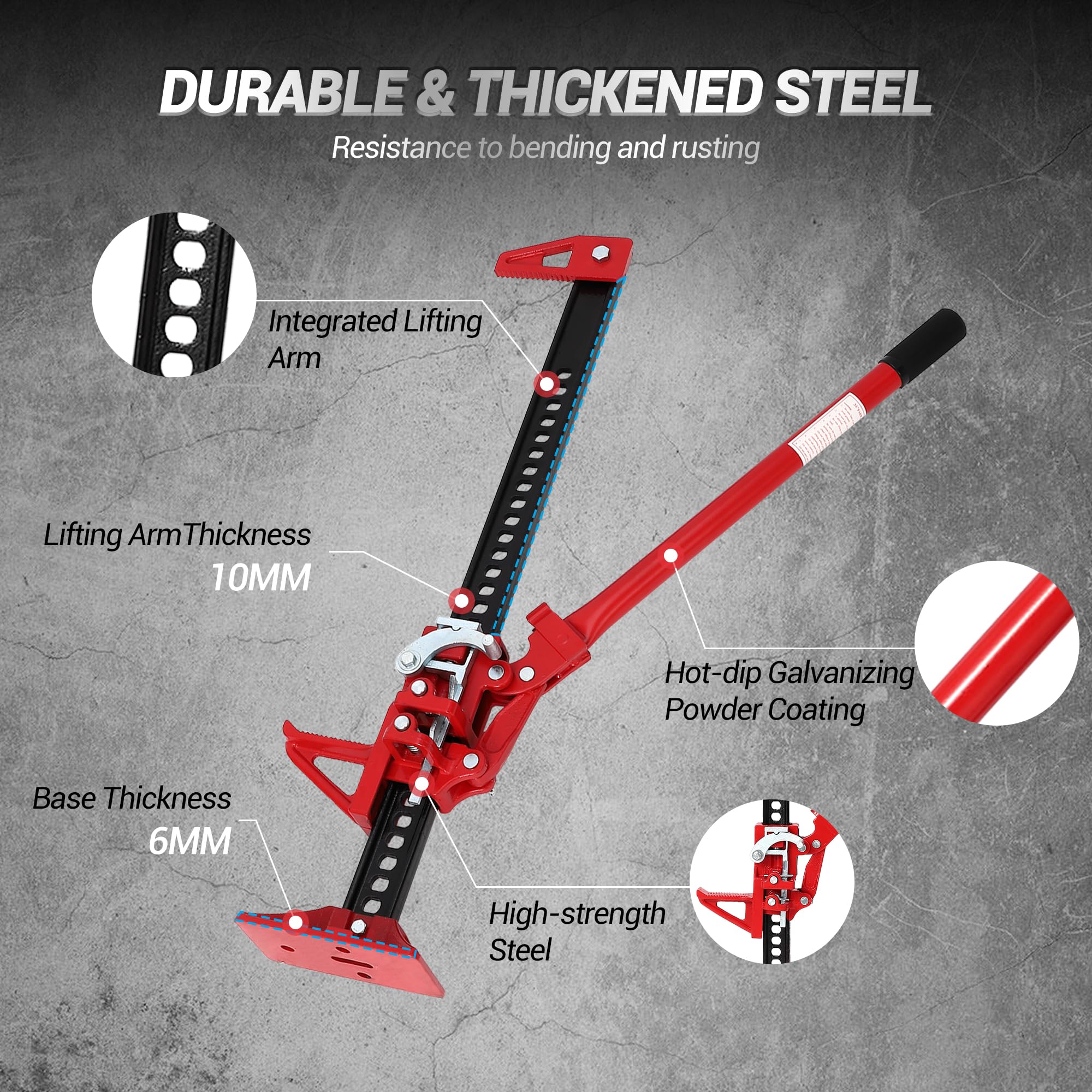 Constructed from high-strength steel with advanced casting techniques, this farm jack is designed to endure extreme environments without compromise. The corrosion-resistant protective coating shields against rust and wear, while simple maintenance routines – like applying rust-resistant treatments – keep it performing like new for years. Tough, reliable, and ready for anything.