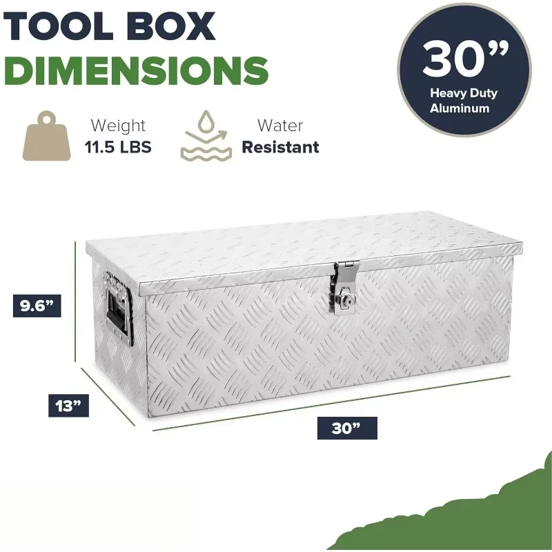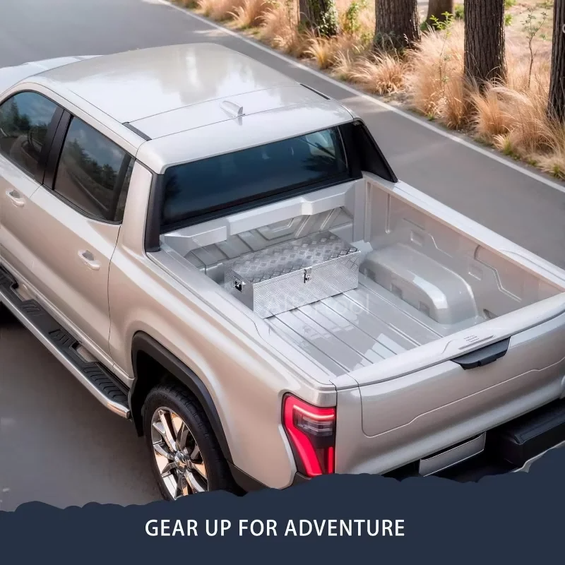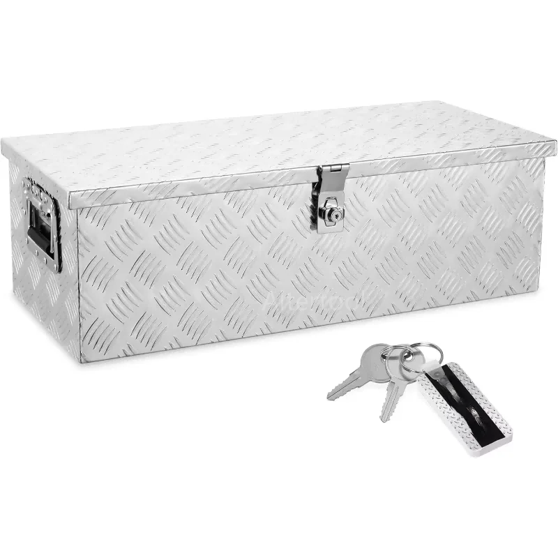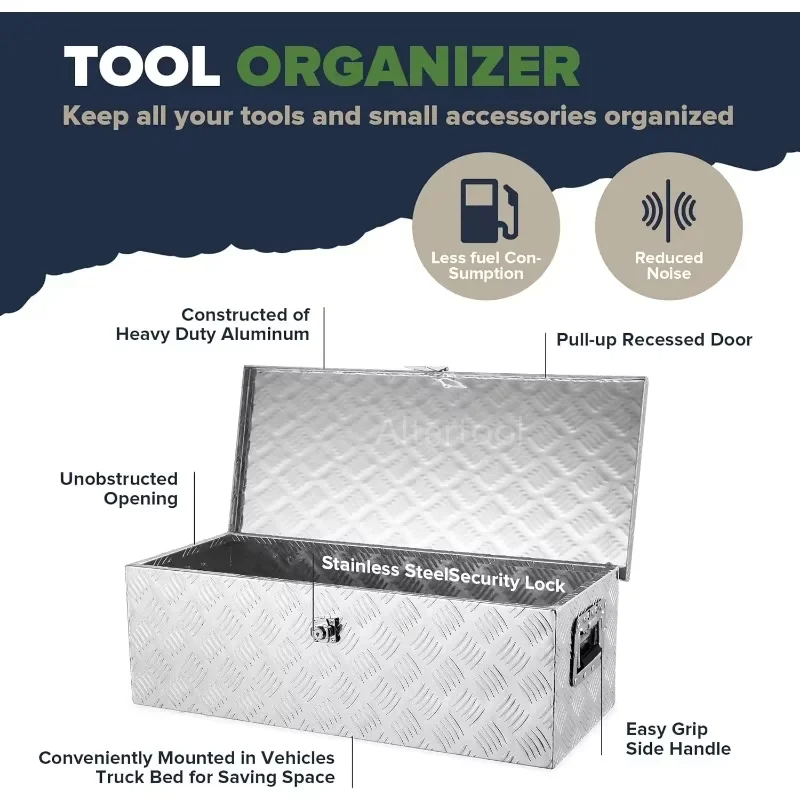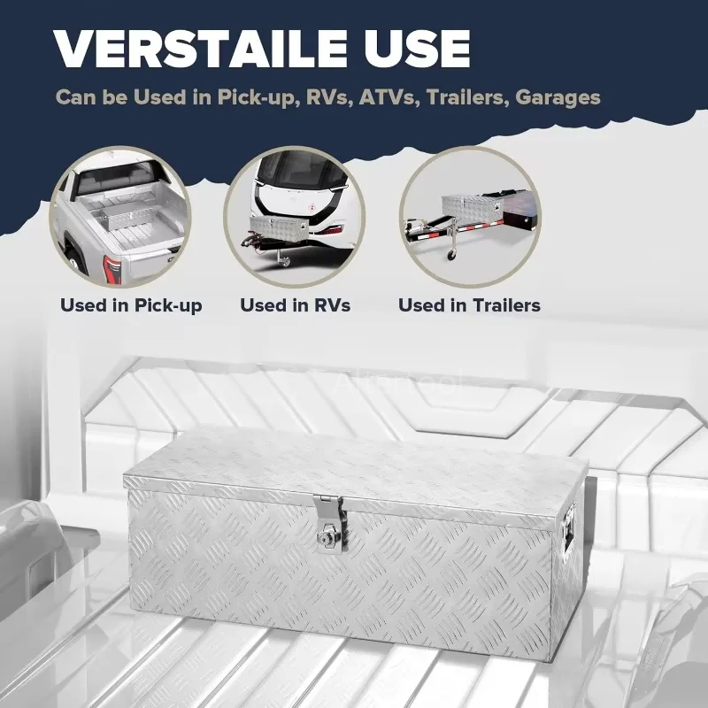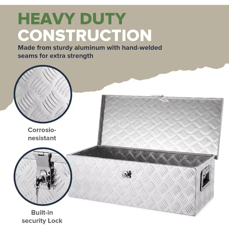 - Industrial-Grade Construction Built with a rugged 5-bar tread aluminum plate, this toolbox provides exceptional resistance against impact, warping, and corrosion. The textured surface not only adds structural reinforcement but also provides a non-slip finish, ensuring the box maintains its integrity even in harsh working environments.